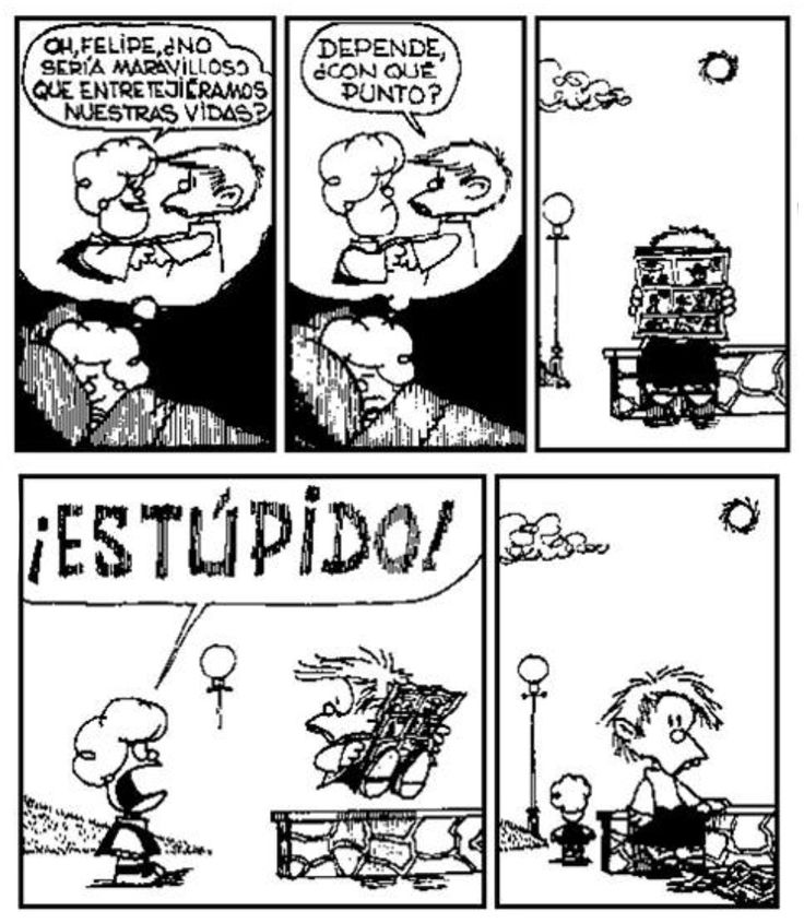 Susanita dormida sueña: -“Oh, Felipe, ¿No sería maravilloso qué entretejiéramos nuestras vidas”? – “Depende, ¿con qué punto”? responde Felipe. Al día siguiente. Felipe se encuentra leyendo una revista, de pronto, Susanita se acerca y por detrás le grita ¡TONTO! Da media vuelta y se retira. Felipe, no solamente, por el susto cae sentado al piso sino que queda confundido: no atina a comprender la actuación de Susana.